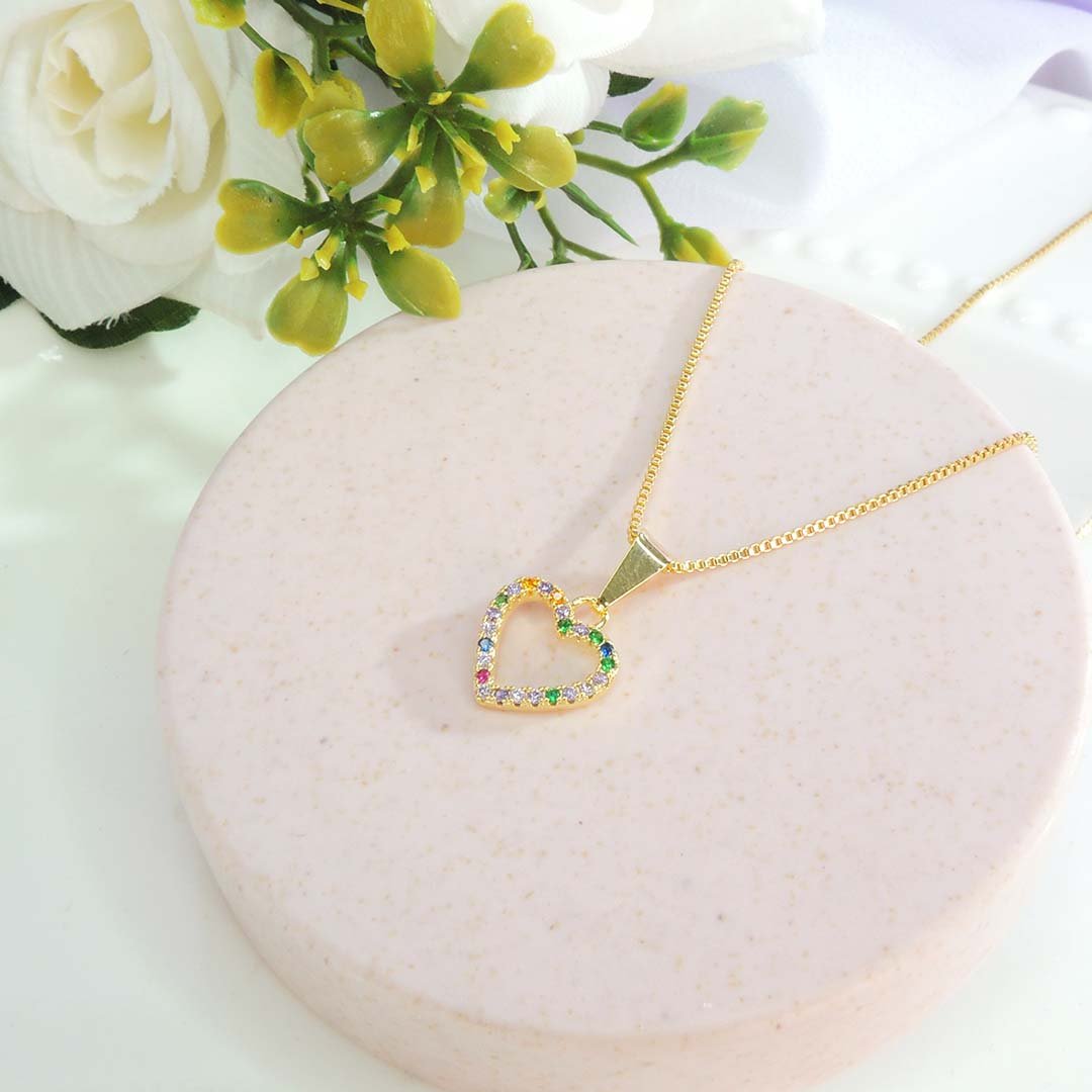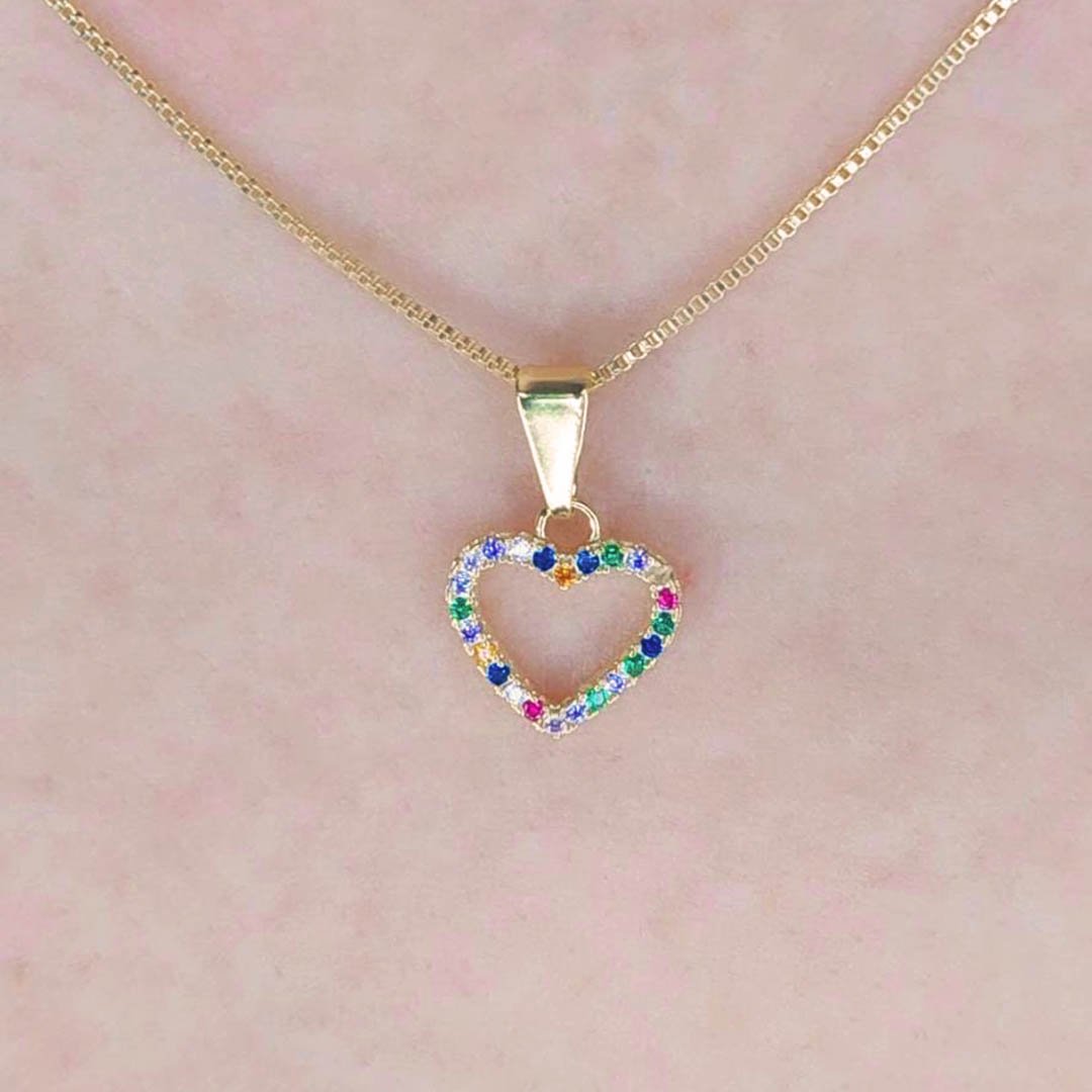 Este colar exibe um pingente em formato de coração, adornado com zircônias coloridas em uma variedade de tons vibrantes. Cada zircônia brilha intensamente, refletindo a luz de maneira deslumbrante e criando um efeito mágico ao redor do pescoço.